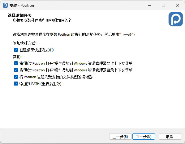 运行安装程序并安装Positron。当被要求时,请勾选所有选项。